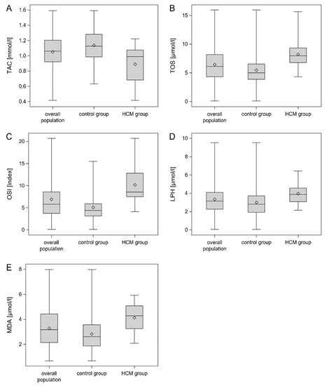 Box with whisker plots for TAC (A), TOS (B), OSI (C), LPH (D) and MDA (E) concentrations. Legend: Figure 3 presents box-and-whisker plots of the TAC, TOS, OSI, LPH and MDA serum concentrations in the total population, HCM group and control group. The concentrations of TOS, OSI, LPH and MDA were significantly higher in the HCM group than in the control group (p < 0.001). In turn, the TAC concentration was significantly lower in the HCM group than in the control groups (p < 0.001). The lower and upper lines of the “box” are the 25th and 75th percentiles of the sample. The distance between the top and bottom of the box is the interquartile range. Abbreviations: LPH—lipid hydroperoxide; MDA—malondialdehyde; OSI—oxidative stress index; TAC—total antioxidant capacity, TOS—total oxidant status.