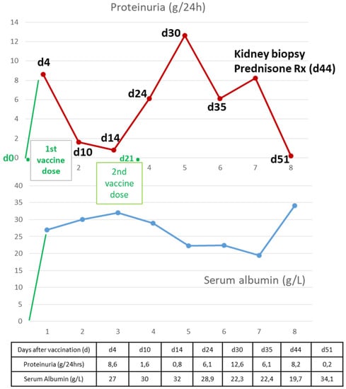 4]. In most cases, MCD occurred shortly (4–14 days) after the first dose, presenting as abrupt onset of clinically overt nephrotic syndrome. The age spectrum in adults ranged from 19 to 82 years and the disease did not always follow a benign course, since four out of the seven cases were also complicated by acute kidney injury (AKI). All seven patients with biopsy-proven vaccine-related MCD received high-dose corticosteroid treatment. In six out of seven patients for whom outcomes were reported, either partial (2 out of 6) or complete (4 out of 6) remission occurred soon after treatment initiation.