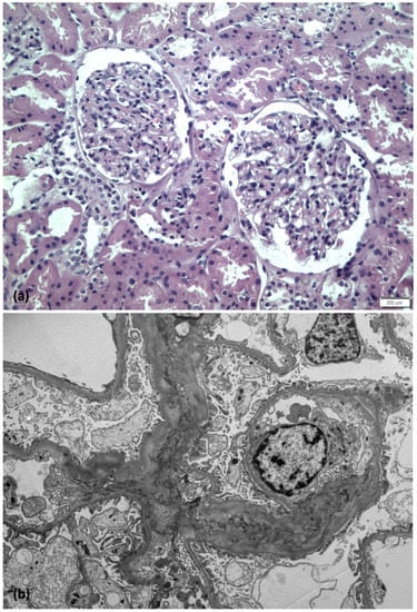 On light microscopy, 25 glomeruli were identified—three of them with global sclerosis. Glomeruli appeared unremarkable; focally mild mesangial expansion was present. Tubular atrophy and interstitial fibrosis were mild, while vessels exhibited mild to moderate arteriosclerosis. Immunofluorescence examination revealed no immune deposits. Accordingly, on electron microscopy examination, no electron dense deposits were found, while diffuse foot process effacement with microvillous transformation was demonstrated (
