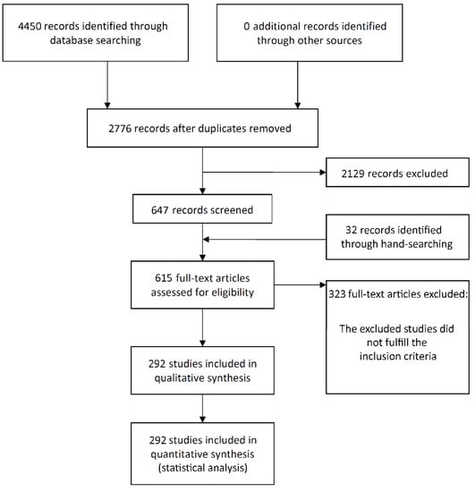 The study selection process is summarized in Figure 1. The search initially resulted in 4450 papers (1454 in PubMed, 1767 in Web of Science, 1229 in ScienceDirect—in the last one the filter ‘Article type—Research articles’ was used, as well as the terms ‘dental implant’ and ‘oral implant’ between quotation marks, due to the great number of initial entries), of which 292 publications were eligible for inclusion (see Supplementary Materials for list of included articles).