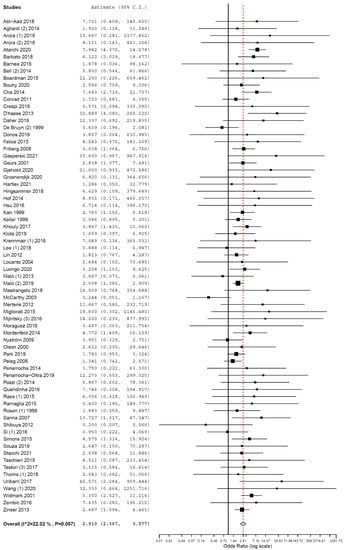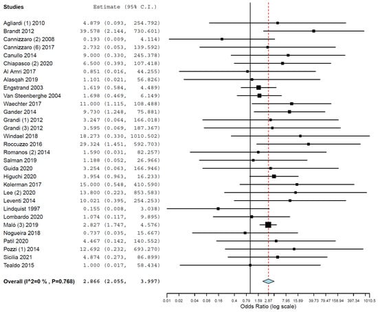 Subgroup analyses were performed for the group of studies evaluating implants inserted exclusively in different jaws. The OR for implant failure when only studies evaluating implants inserted in maxillae were pooled was 2.910 (95% CI, 2.367, 3.577, p < 0.001; Figure 2), and when only studies evaluating implants inserted in mandibles were pooled was 2.866 (95% CI, 2.055, 3.997, p < 0.001; Figure 3).
