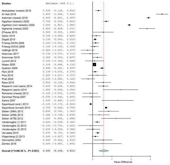 The MD of MBL between the groups was 0.580 mm (95% CI, 0.330, 0.831, standard error = 0.128, p < 0.001) (τ2 = 0.578, Chi2 = 5985.613, I2 = 99.382, p < 0.001) (Figure 4), meaning that implants placed in smokers presented a mean 0.580 mm higher MBL than the implants placed in non-smokers. The difference was statistically significant.