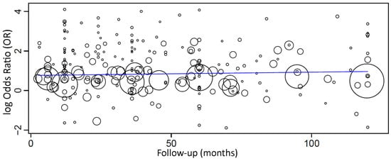 However, none of these meta-regressions between follow-up and OR were statistically significant.