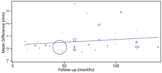 A meta-regression considering the effect of follow-up on MBL mean difference between groups (Figure 6) resulted in the following first-degree equation: