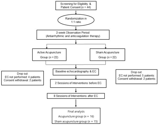 After EC, the participants continued to receive active or sham acupuncture treatment once per week for the next 10 weeks and were permitted to receive heart rate-control drugs. A flowchart of the study is presented in Figure 1.