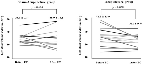 Compared with the baseline value, the LA size (LAVI) in the patients treated with acupuncture was significantly reduced (from 42.2 ± 13.9 to 36.1 ± 9.7 mL/m2; p = 0.028; Table 1 and Table 2). In contrast, there was no significant change in LAVI before and after EC in patients of the sham acupuncture group (from 38.1 ± 7.7 to 36.9 ± 14.1; p = 0.664; Table 1 and Table 2). Figure 3 shows the change in LA volume index at the individual patient level and a clear trend of decreasing LA volume in patients treated with acupuncture. In logistic regression analysis, acupuncture treatment did not predict AF recurrence at three months (data not shown).