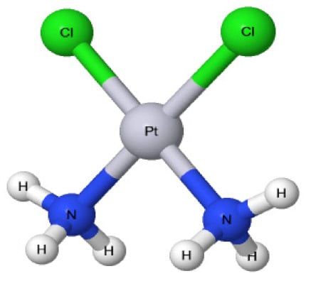 Chemical structure of cisplatin. Two neutral ammonia (NH3) ligands and two chloride (Cl) anions are coordinated to the central platinum (Pt) ion.