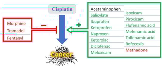 Cisplatin (CDDP) is a platinum-based agent that has long been used in the treatment of various types of malignancies [1]. Unfortunately, CDDP may cause toxic side effects on normal human tissues that might lead to multiple organ damage [2,3]. During chemotherapy, several patients may suffer from pain and are likely to take medications to relief it. According to the level of the pain, these medications may range from acetaminophen or non-steroidal anti-inflammatory drugs (NSAIDs), in the case of mild to moderate pain, reaching up to stronger pain killers such as narcotic analgesics in the case of severe pain. It is possible that administering these medications concomitantly with CDDP might augment CDDP-induced organ toxicity or alter its anticancer efficacy. To date, the interactions of analgesics with CDDP have not been fully reviewed. Here, data were collected from the literature to formulate an updated review of the molecular mechanisms that might be involved in the interactions of different types of analgesics with CDDP, and the implications of such interactions on rational use of analgesics for the treatment of pain during CDDP cancer chemotherapy in humans.