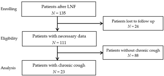 In this study, we analyzed 23 of 111 patients (20.7%) reporting chronic cough. All patients underwent LNF in one surgical department from 2014 to 2018. Patients constituted 17 women and 6 men. Twelve patients (52%) reported daily, while 11 patients (48%) reported often coughs. The mean age was 47 years (range 27–76 years, ±13.9 years). The mean follow-up time was 48.3 months (range 22.6–76.3 ± 18.05 months). There were no postoperative complications in this group.