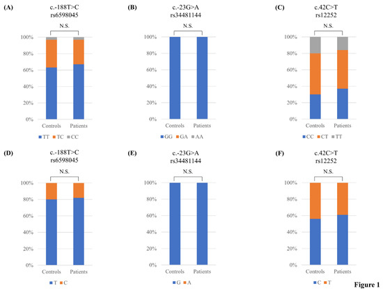 Comparisons of the genotype and allele frequencies of rs6598045, rs34481144 and rs12252 single nucleotide polymorphisms (SNPs) of the interferon-induced transmembrane protein 3 (IFITM3) gene in AD patients and matched healthy controls: (A) Comparison of the genotype frequency of the rs6598045 SNP of the IFITM3 gene between these two groups; (B) Comparison of the genotype frequency of the rs34481144 SNP of the IFITM3 gene between these two groups; (C) Comparison of the genotype frequency of the rs12252 SNP of the IFITM3 gene in these two groups; (D) Comparison of the allele frequency of the rs6598045 SNP of the IFITM3 gene between these two groups; (E) Comparison of the allele frequency of the rs34481144 SNP of the IFITM3 gene between these two groups; (F) Comparison of the allele frequency of the IFITM3 rs12252 SNP between these two groups. N.S.: not significant.