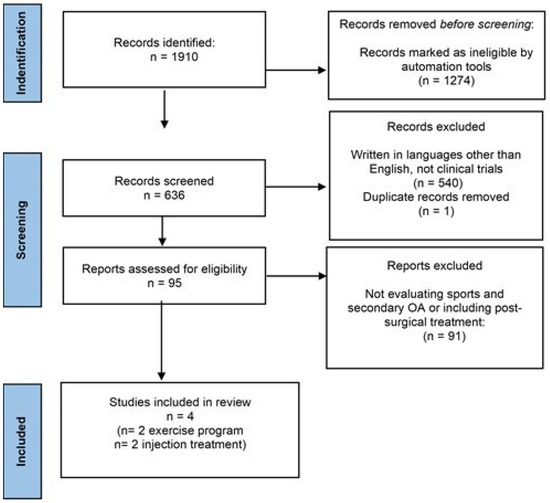 The authors, having clinical and research experience on the topic, formulated a research question defined as follows: What is the most recent evidence for the role of therapeutic exercise or injection therapies in athletes with early OA or predisposing conditions for OA?