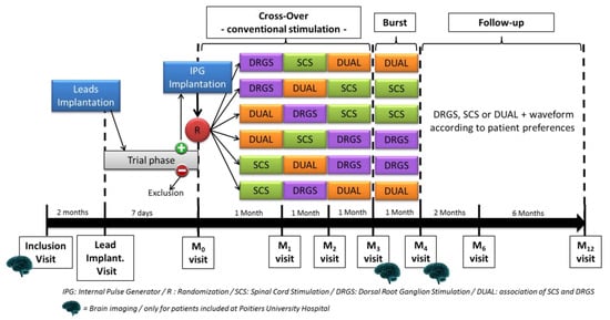 Despite potential interest, this study has several limitations. First, as mentioned above, the comparison between TCS (involving a paresthetic effect) versus burst (a paresthesia-free modality) will not be performed under strict and homogeneous blinded conditions, by sequentially testing the different stimulation modalities. However, burst will be applied for the three groups (SCS, DGRS and DUAL) between the 3rd and the 4th month after randomization, which will allow for the comparison of paresthesia-free conditions as a second step, in a second phase. This should not interfere with our main endpoint, at 3-month follow-up, involving TCS and paresthesia for each group of stimulation, in a strict double-blind manner. Second, this crossover design will not allow us to determine long-term efficacy of each stimulation modality, since multiplying the number of modalities to evaluate implies proportionally decreasing the length of the follow-up period for financial and ethical reasons. An alternative point of view would counterbalance this loss of potential valuable information with the fact that this design can also be considered as “added value” for the patient, who will be able to choose his preferred spatial target and waveform, thereby enhancing treatment adherence. Following this perspective, we will collect maximal follow-up for the stimulation modality, which will reflect the patient’s preference. Third, the absence of wash-out period will not allow us to claim that one modality could not induce a carryover effect. However, the 1-month period used for each modality should cancel out this potential carryover effect. Fourth, mechanisms of actions will be assessed at the supraspinal level, even though some modulations can occur at the spinal level. In their in vitro simulation study, Zannou et al. [74,75] interestingly reported tissue heating when stimulation was applied at a high-frequency modality, which that may impact more or less long-term clinical outcomes. Realistic anatomical computational models of SCS are crucial tools and provide opportunities to better understand the role of complex tissue compartments in shunting the current applied to the potential neural targets [74,75,76].