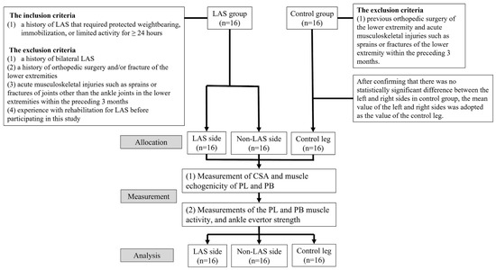 Figure 1 shows the flowchart of this study. Thirty-two participants were included in this study: 16 with a history of LAS at least twice on the unilateral leg (8 men and 8 women, LAS group) and 16 participants with no history of LAS of the ankle joint (8 men and 8 women, control group). All participants participated in recreational exercises at least once per week. Table 1 shows the profiles of the participants. The inclusion criteria for the LAS group were a history of LAS that required protected weightbearing, immobilization, or limited activity for ≥ 24 h [22]. The exclusion criteria for the LAS group were as follows: (1) a history of bilateral LAS, (2) a history of orthopedic surgery and/or fracture of the lower extremities [23], (3) acute musculoskeletal injuries such as sprains or fractures of joints other than the ankle joints in the lower extremities within the preceding 3 months [23], and (4) experience with rehabilitation for LAS before participating in this study [24]. The exclusion criteria for the control group were previous orthopedic surgery of the lower extremity and acute musculoskeletal injuries such as sprains or fractures of the lower extremity within the preceding 3 months. The participants recruitment period was 1–31 October 2020. Since no previous study had measured the CSA of the peroneus muscles in the distal 75% via ultrasonography, a pre-study sample size was estimated from the CSA at the distal 75% of 3 legs on the LAS side (mean 2.54 cm2), 3 legs on the non-LAS side (mean 2.13 cm2), and 3 legs of the control participants (mean 1.99 cm2) with an alpha level of p < 0.05 and a power = 0.8 using G*Power 3.1 (Kiel University, Germany). A minimum of 48 legs was estimated.