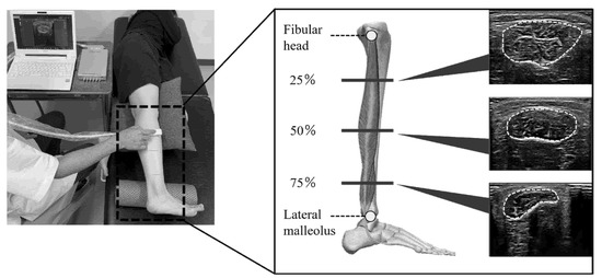 A B-mode ultrasound system (ArtUs EXT-1H; Telemed, Vilnius, Lithuania) with an ultrasound probe (5–11 MHz, 60 mm field-of-view; Echoblaster, Telemed, Vilnius, Lithuania) was used to obtain images of the peroneus muscles in the short-axis view. All ultrasound measurements were performed by the same therapist with three years of specialization and experience.