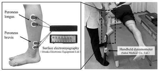 A handheld dynamometer (Mobie; Sakai Medical Co., Ltd., Tokyo, Japan) was used to measure the ankle evertor strength, alongside the measurement of muscle activity. As for the previous measurement, the participant was placed in the same lateral position on the bed [26]. The strap of the handheld dynamometer was placed on the fifth metatarsal head of the foot of the upper leg, and the participant performed an isometric active ankle eversion with maximum effort for 5 s in the maximum plantarflexion position. The reproducibility of this measurement method was confirmed in a previous study [26]. Three measurements were performed bilaterally (Figure 3).