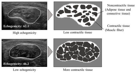 Muscle echogenicity in the ultrasound image. As shown in the upper illustration, the higher the value of muscle echogenicity, the brighter the image appears, indicating more noncontractile tissue in the muscle. As shown in the lower illustration, the lower the value of the muscle echogenicity, the darker it appears in the image, indicating less noncontractile tissue in the muscle.