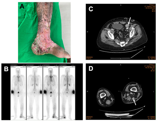 Preoperative image evaluation of the left lower leg and foot SCC. (A) SCC presented as pigmented skin and chronic ulcers below the left knee, especially at ankle and heel; (B) Tc-99m MDP whole-body bone scan revealed increased radioactivity in the left calcaneus, extraosseously over the left lower leg and foot (due to soft tissue swelling), calvarium, thoracolumbar spine (due to certain degenerative change), and focal radiotracer accumulation in the right wrist, which may indicate injection sites; and contrast-enhanced computed tomography showed enlarged and enhanced lymph nodes along (C) the left external iliac vessels (greatest diameter: 3.16 cm, white arrow) and (D) the left popliteal fossa (greatest diameter: 2.13 cm, white arrow).