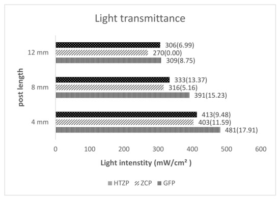- The fiber-reinforced composite post showed the highest light transmission intensity at different lengths compared to the high translucent post and ceramic zirconia post;
