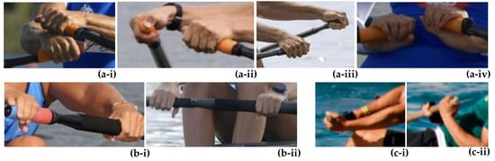 On water, rowers can either row holding one oar with both hands (sweep rowing) or row holding a pair of oars, one in each hand (sculling). From the perspective of the hand, the rowing action involves constant “gripping” of the oar (with one or two hands), “pulling” actions, and a “rotation” (feathering) of the oar with every stroke during the drive phase, as well as a less demanding “pushing” and rotation during the recovery phase of the stroke, as described in Figure 1.