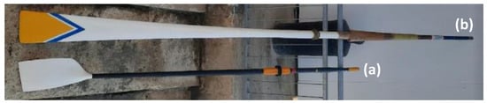 Typical oars used for sculling are around 284 cm–290 cm in length, whilst oars used for sweep rowing are typically longer, circa 370 cm–376 cm in length. Oars are now typically all made from composite materials, which provide excellent weight-to-strength ratio and permit mass production, with the more common shape of the “blade” being the hatchet/cleaver blade style, first introduced in 1992, which is shown in Figure 2a. The oars used in fixed-seat boats, mainly seen in traditional events with a historical context, such as the Maltese Traditional Regattas and in the Cornish County Championships (UK), are typically heavier (i.e., more difficult to handle and feather), designed in a more traditional manner, and made of wood as shown in Figure 2. Note that in such traditional rowing, the use of a “reverse grip” for holding the oar is not uncommon (see Figure 1c, to be compared with the sweep “standard grip” in Figure 1b).