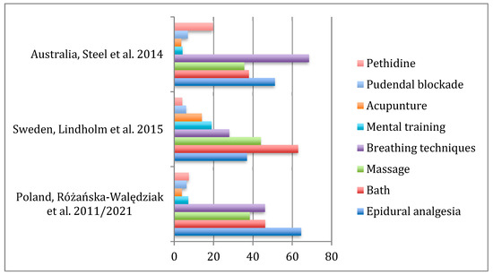 An earlier Swedish study from 2015, by Lindholm et al. presented analgesia preference of 936 pregnant women. Overall, 79% of women preferred nitrous oxide, 63%—bath, 44%—massage, 37%—EDA, 28%—breathing techniques. Some methods were less popular—19% women preferred mental training, 14%—acupuncture, 6%—pudendal blockade and only 4% pethidine. Other methods were TENS (7%) and sterile water injections (2%). Nitrous oxide was not included in our questionnaire due to lack of its availability in our center in 2010; we decided not to include it in the 2020 questionnaire either, as we wanted the questionnaire to remain unchanged at both our time-points. In our study, 64.5% of women indicated EDA as the most efficient method of pain relief (more than three times more than in the Swedish group), followed by warm bath—46.3%, breathing techniques—46.1%, massage—38.4%, music therapy −13.4%. Less than 10% of women chose other methods, among whom 7.4% indicated pethidine (almost two times more than on the Swedish study). A comparison of women’s preferences between different studies is presented in Figure 1.