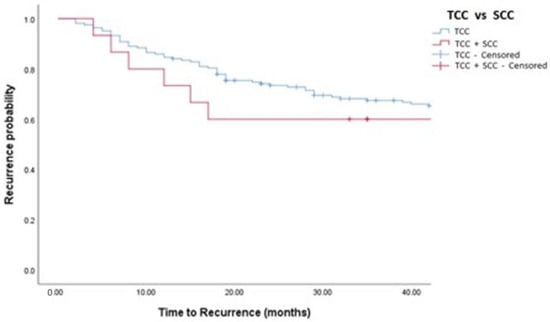 Median follow-up was 36 (IQR: 18–50) months. Oncological outcomes are shown in Table 1, Table 2 and Table 3 and Figure 1, Figure 2, Figure 3 and Figure 4. Recurrence was observed in 42% of TCC and 44% of TCC + SCC patients (p = 0.88), while progression was observed in 12% of both TCC and TCC + SCC patients (p = 0.78). Patients treated with MMC showed a 1- and 3- year recurrence-free survival (RFS) of 74% and 51% for TCC and 60% and 43% in TCC + SCC, respectively. Patients treated with BCG showed a 1- and 3- year RFS of 62% and 42% for TCC and 71% and 59% for TCC + SCC, respectively.