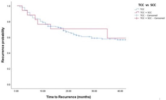 Kaplan–Meier analysis showing estimates of disease recurrence in in TCC and TCC + SCC patients treated with BCG (log-rank p = 0.532).