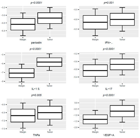 Box-plot- levels of periostin, VEGF-A, IFN-γ, IL-1 β, IL-17, TNFα molecules in tumor and tissue margins; protein levels are presented as log-transformed values as g/g. Paired T-student’s test.