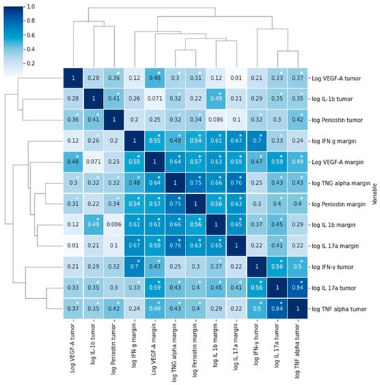 We found significant correlations between periostin levels in tumor and VEGF-A, IFN-γ, IL-1β, and TNFα concentrations in tumor (Figure 1, Table 3). A significant correlation was found between periostin levels in margin and VEGF-A, IFN-γ IL-1 β, IL-17, and TNFα in tumor and margin specimens (Figure 2, Table 3).
