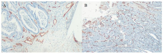 CD 34 immunostaining was performed in 24 randomly selected cases. Tissue samples were obtained from formalin-fixed paraffin-embedded tissue blocks with primary CRC and tumor-free margin samples. Then, the samples were deparaffinized and rehydrated. We then performed antigen recovery by boiling the slides in EnVision Flex Target Retrieval Solution High pH (Dako, Carpinteria, CA, USA) for 20 min at 95 °C. Prepared samples were incubated with peroxidase blocked reagent (Dako, Carpinteria, CA, USA) and then incubated with CD34 antibody (clone: QBEnd/10 Cell Marque, Rocklin, CA, USA; incubation time: 30′; dilution: 1:150). In the next step, the samples were placed in EnVision FLEX HRP (Dako, Carpinteria, CA, USA). The antigen-antibody complexes were then stained with 3,3′-diaminobenzidine. Finally, tissue sections were counterstained with hematoxylin, dehydrated and covered with coverslips for further analysis.