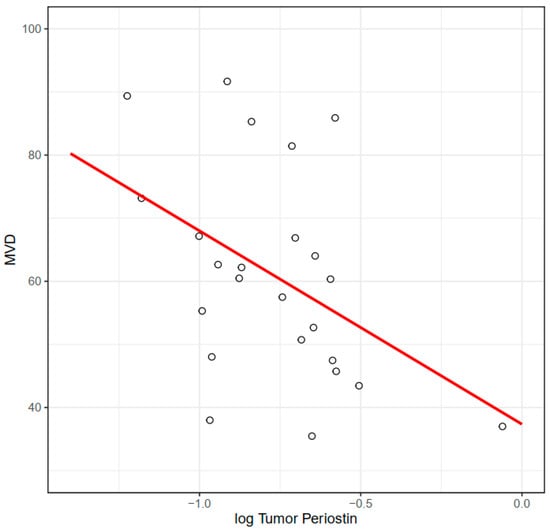 Association between MVD at the invasive front and periostin concentration (R = −0.44, p = 0.036). R—Pearson’s correlation coefficient.