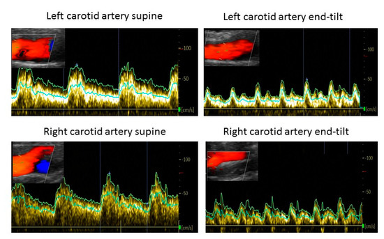 - Van Campen, L.M.C.; Verheugt, F.W.A.; Visser, F.C. Cerebral blood flow changes during tilt table testing in healthy volunteers, as assessed by Doppler imaging of the carotid and vertebral arteries. Clin. Neurophysiol. Pract. 2018, 3, 91–95. [Google Scholar] [CrossRef] [PubMed]