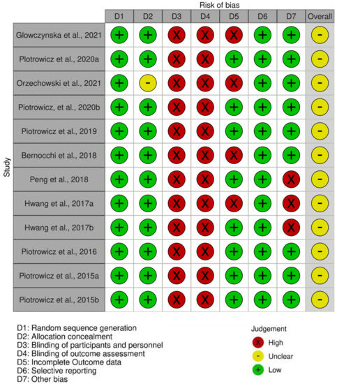 - Sterne, J.A.C.; Savović, J.; Page, M.J.; Elbers, R.G.; Blencowe, N.S.; Boutron, I.; Cates, C.J.; Cheng, H.-Y.; Corbett, M.S.; Eldridge, S.M.; et al. RoB 2: A Revised Tool for Assessing Risk of Bias in Randomised Trials. BMJ 2019, 366, 898. [Google Scholar] [CrossRef]