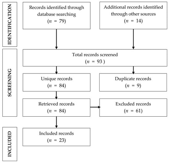 The database search has gathered a number of 93 articles addressing the topic of elective surgery for colorectal cancer during the COVID-19 pandemic. Nine articles containing duplicated data were removed, leaving 84 articles for the review. We have excluded review articles, case reports, letters to editors and short comments. Subsequently, we have checked if the articles had data regarding the number of elective procedures, comparing the pandemic period with the previous period, and if the length of hospital stay, waiting time for hospital admission, and eventually postoperative mortality were properly analyzed, finding that 23 articles were suitable for our review. The flow of information for the article selection is presented in Figure 1.
