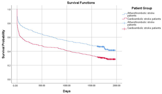 Probability of survival in the atherothrombotic stroke and the cardioembolic stroke groups.