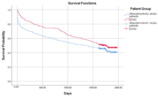 Probability of survival in the atherothrombotic stroke and the direct oral anticoagulant (DOAC) groups.