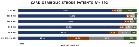 Guglielmi et al. compared atherothrombotic and cardioembolic functional outcomes in ischemic stroke patients and reported better functional outcomes in the atherothrombotic patient group—mRS 3 (IQR = 1–5) versus 4 (IQR = 2–6) in the cardioembolic patient group. Satisfactory functional outcome after 90 days (defined as mRS 0–2) reached 46% in the atherothrombotic ischemic stroke patient group and only in 35% of all cardioembolic ischemic stroke survivors [17]. Jurjans et al. stated that in patients receiving antiplatelet agents, only 3.0% of patients reached satisfactory functional outcomes (mRS 0–2) in 5 years, compared to 30.5% in patients receiving direct oral anticoagulants [8].