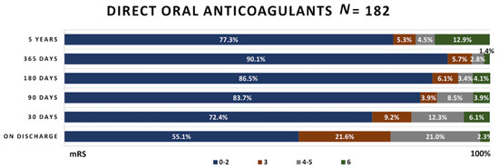 In patients receiving DOACs, more than half of patients reached mRS 0–2, and only 2.3% died while staying in the hospital. Similar functional outcome changes as in the cardioembolic stroke group were observed in these patients; however, 4 year mortality was higher—12.9% compared to 12.5%.