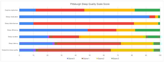The present study focused on sleep quality as the primary outcome, which was assessed using the Pittsburgh Sleep Quality Index (PSQI) []. The PSQI comprises 24 items, of which 19 are self-applicable (with scores from 0 to 3 for each item), and five must be answered by a roommate. This last section is not essential to evaluate the PSQI. The global rating is obtained from the sum of the components where a higher score is indicative of a lower quality of sleep.