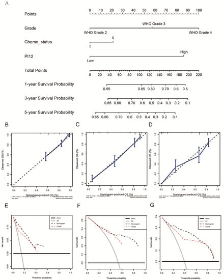 3.5. Construction of a Nomogram for Predicting Glioma OS