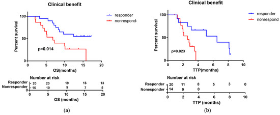 In total, 21 out of 35 (60%) patients had died at the end of follow-up (March 2022). The mean follow-up time was 10 months (range: 2–17.2). The median OS and TTP were 10 months (95% CI: 5.5–14.6) and 3.5 months (95% CI: 2.3–4.7), respectively (Figure 1). The median OS for patients who achieved a response (PR) to HAIC treatment was not reached, and the median OS for patients with SD and PD (non-respondents) was 8.6 months (95% CI: 5.5–11.8). Patients who achieved clinical benefits (CR + PR + SD) showed a longer OS and TTP compared with people without clinical benefits (median OS, not reached vs. 6.8 months, p = 0.014; median TTP, 6.5 months vs. 2.6 months, p = 0.023) (Figure 2). These results show that achieving a clinical benefit could predict the patients’ survival. In addition, patients with anti-PD-1 combination therapy showed better OS and TTP than without anti-PD-1 immunotherapy (median OS, 15.8 months (95% CI 7.4–24.2) vs. 6.7 months (95% CI 3.7–9.8), p = 0.01; median TTP, 6.5 months (95% CI 1.6–11.4) vs. 2.1 months (95% CI 1.1–3.0), p = 0.043) (Figure 3).