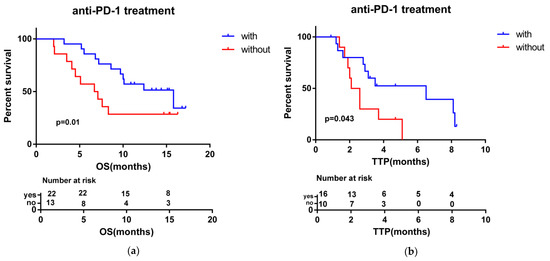 Kaplan–Meier curves for OS (a) and TTP (b) in patients, stratified by treatment with or without anti-PD-1 immunotherapy.