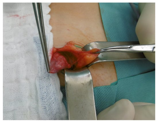 Recent therapeutic approaches consider laparoscopic intervention for the treatment of female hydroceles [8,30,57,58]. In particular, the transabdominal preperitoneal (TAPP) and the totally extra-peritoneal (TEP) techniques are considered as popular laparoscopic methods, which can also be used in the treatment of cyst of the canal of Nuck [8,12,30,58]. Laparoscopy can not only be used as a treatment option, but also as an additional diagnostic method to determine the hydrocele and anatomical conditions. Compared with TEP, TAPP has a better diagnostic potential, due to the improved imaging of the abdominal cavity, its anatomical variations and the hydrocele itself [8,12,30,58]. However, sometimes difficult anatomical conditions may prevent a laparoscopic repair, requiring conversion to traditional open anterior surgery [59]. Furthermore, laparoscopic intervention requires a mesh prosthesis to repair the defect within the abdominal wall [8,30,58]. Therefore, the surgical intervention of a cyst of the Nuck’s canal must be well considered and adapted in advance of to the anatomical conditions, as well as the skill of the surgeon.