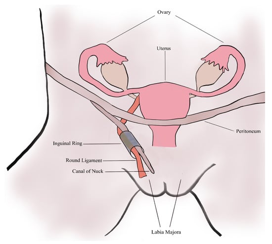 In 1691, Anton Nuck, a Dutch anatomist, was the first to describe the canal of Nuck [24]. The canal of Nuck is the female equivalent to the processus vaginalis in males, which usually disappears within the first year of life. It consists of an evagination of peritoneum, which is attached to the uterus by the round ligament, and proceeds through the inguinal ring alongside the round ligament into the labia majora [3,11]. Usually, the superior part of this outpouch obturates during or just before birth and disappears within the first year of life. In rare cases, this obturation fails, resulting in a persistence of the canal of Nuck [3,4,24] (Figure 4), which can cause the formation of a female hydrocele, namely the cyst of the canal of Nuck [1,13]. This phenomenon in women was first reported by Coley in 1892 [25]. Similar to the male hydrocele, a female hydrocele probably arises due to an imbalance of secretion from and absorption of fluid by the secretory membranes of the canal of Nuck [3,26]. Although this imbalance is most frequently idiopathic, disturbed lymphatic drainage caused by trauma, infection or inflammation are other possible reasons [11,16].