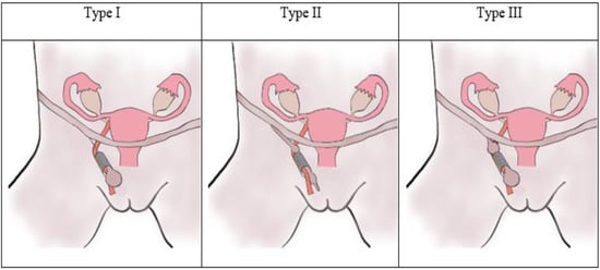 The commonly used classification was developed by Counseller and Black, who classified cysts of the canal of Nuck into three different types [29]. The most prevalent type forms a hydrocele along the round ligament without any communication with the peritoneal cavity. The second type communicates with the peritoneal cavity, and the third, the “hour-glass” type, is constricted by the inguinal ring, whereby one part communicates with the peritoneal cavity, while the other part does not. The three different types of cyst of the canal of Nuck are shown in Figure 5.