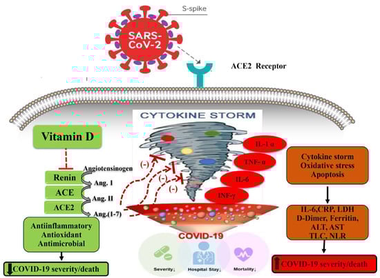 In addition, the adverse outcomes of COVID-19 may be circumvented by vitamin D by modulating the activity of the renin-angiotensin system (RAS) and the expression of the angiotensin-2 converting enzyme (ACE2), which reduces pulmonary permeability in the ARDS experimental model. ACE2 either activates or represses the expression of various genes by binding to the vitamin D response elements (VDRE) found in the gene promoter region (Figure 1) [12,13]. This step is critical because SARS CoV-2 has been shown to infect host cells via employing ACE2 as a receptor [14] and downregulates the expression of ACE2 [15,16]. The downregulation of ACE2 throughout COVID-19 infection causes a cytokine storm in the host, resulting in ARDS [17,18].