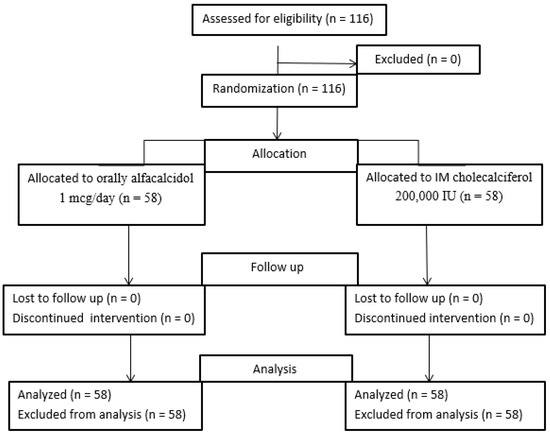 Of the total of 116 hospitalized COVID-19 patients who were included in the study, 58 patients received treatment with low-dose vitamin D and 58 received treatment with high-dose vitamin D. Baseline characteristics of the two groups are presented in Table 1. Mean age, inflammatory mediators (lactate dehydrogenase (LDH), serum ferritin, C-reactive protein (CRP), liver enzymes, oxygen saturation, and respiratory rate) were similar in both groups with no statistically significant difference.
