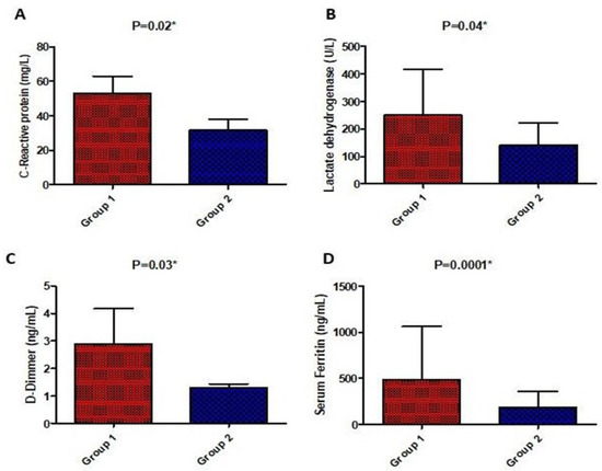 Comparison of serum biochemical parameters (C-reactive protein (A), lactate dehydrogenase (B), D-Dimer (C), and ferritin (D)) post-treatment between the studied groups. Values are illustrated as means ± SD. * represents a significant difference between both groups at p < 0.05.