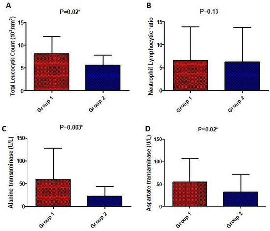Comparison of laboratory parameters (total leucocytic count (A), neutrophil lymphocytic ratio (B), serum alanine transaminase (C), and aspartate transaminase (D)) post-treatment between the studied groups. Values are illustrated as means ± SD. * represents a significant difference between both groups at p < 0.05.