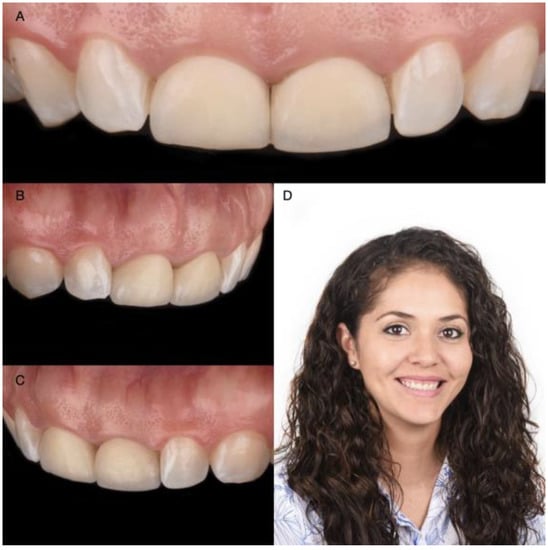 Initial scenario: (A) Intraoral frontal view; (B) Intraoral right-side view; (C) Intraoral left-side view; (D) Headshot of face smiling.